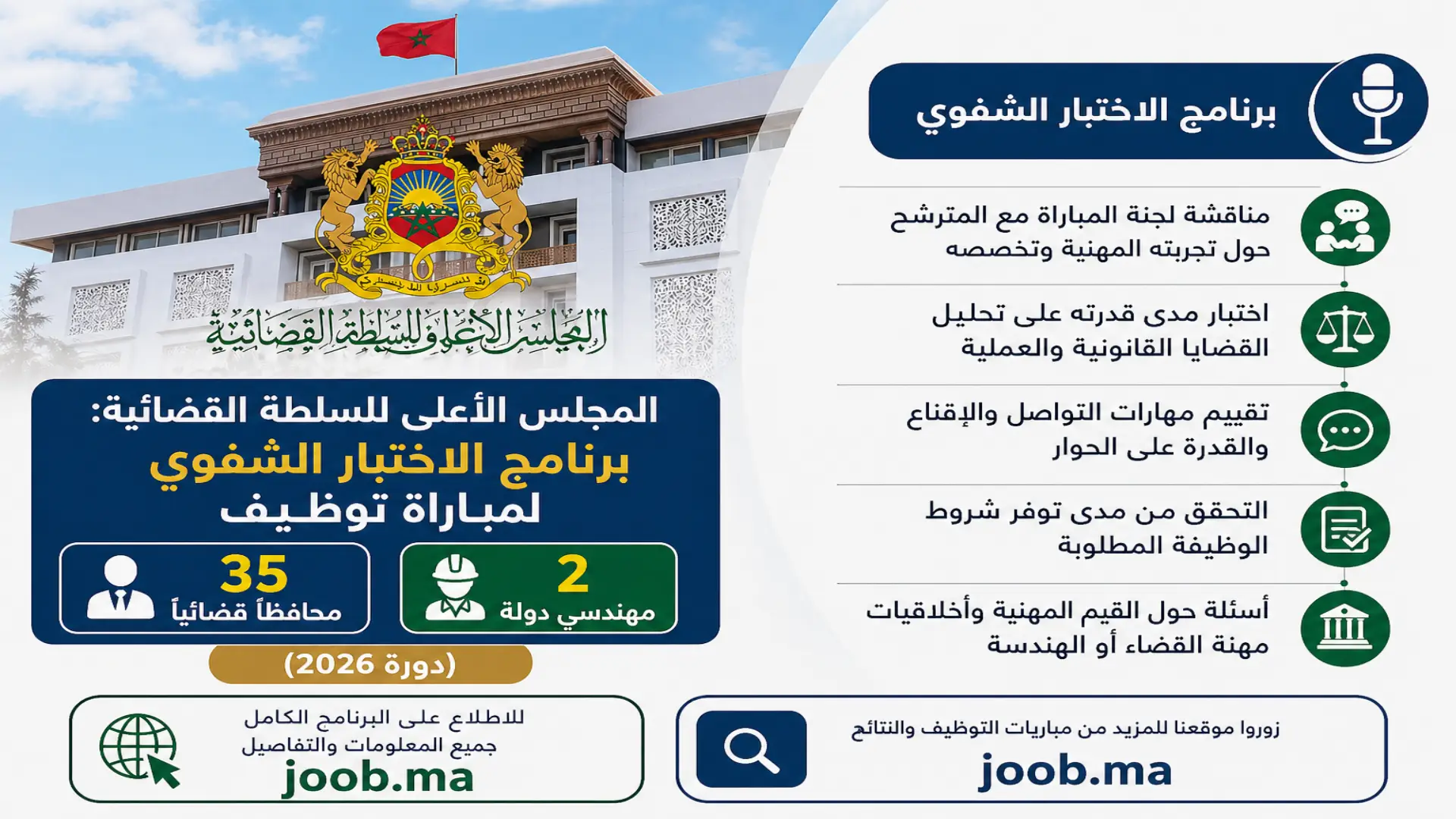 يعلن المجلس الأعلى للسلطة القضائية عن برنامج الاختبار الشفوي الخاص بمباراة توظيف محافظين قضائيين من الدرجة الثانية (السلم 11) ومهندسي الدولة من الدرجة الأولى (السلم 11)، التي أُجري اختبارها الكتابي بتاريخ 5 أبريل 2026، وذلك في التخصصات التالية: