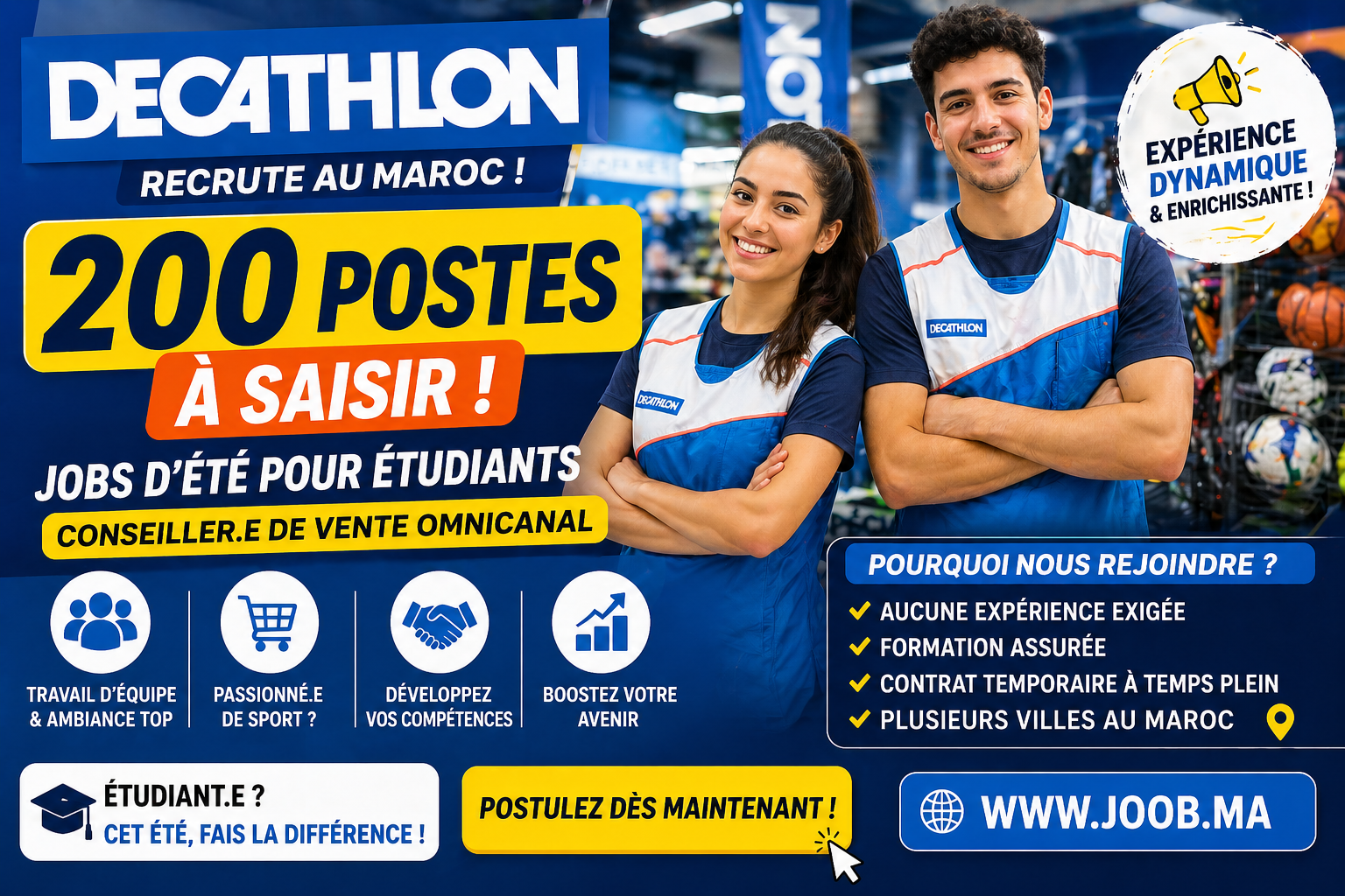 أعلنت شركة Decathlon عن فتح باب التوظيف لفائدة الطلبة في عدة مدن بالمغرب، وذلك ضمن وظائف صيفية (Jobs d’été) لسنة 2026.