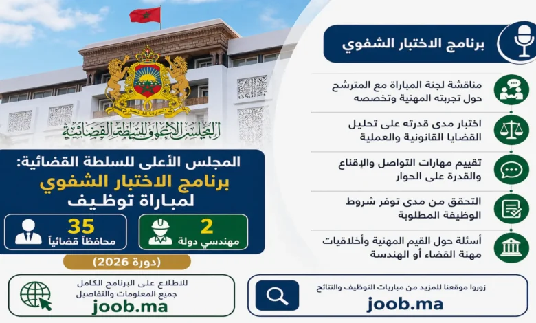 يعلن المجلس الأعلى للسلطة القضائية عن برنامج الاختبار الشفوي الخاص بمباراة توظيف محافظين قضائيين من الدرجة الثانية (السلم 11) ومهندسي…