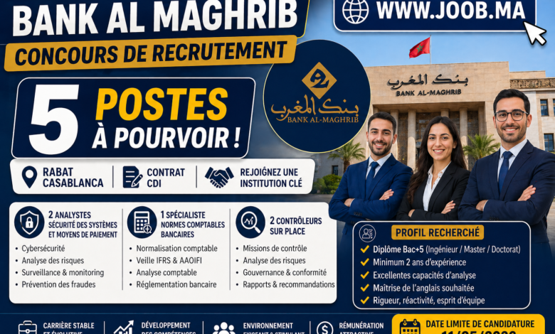 مقدمة أعلن بنك المغرب عن فتح باب التوظيف لسنة 2026 لتوظيف 5 مناصب في كل من الرباط والدار البيضاء، وذلك…